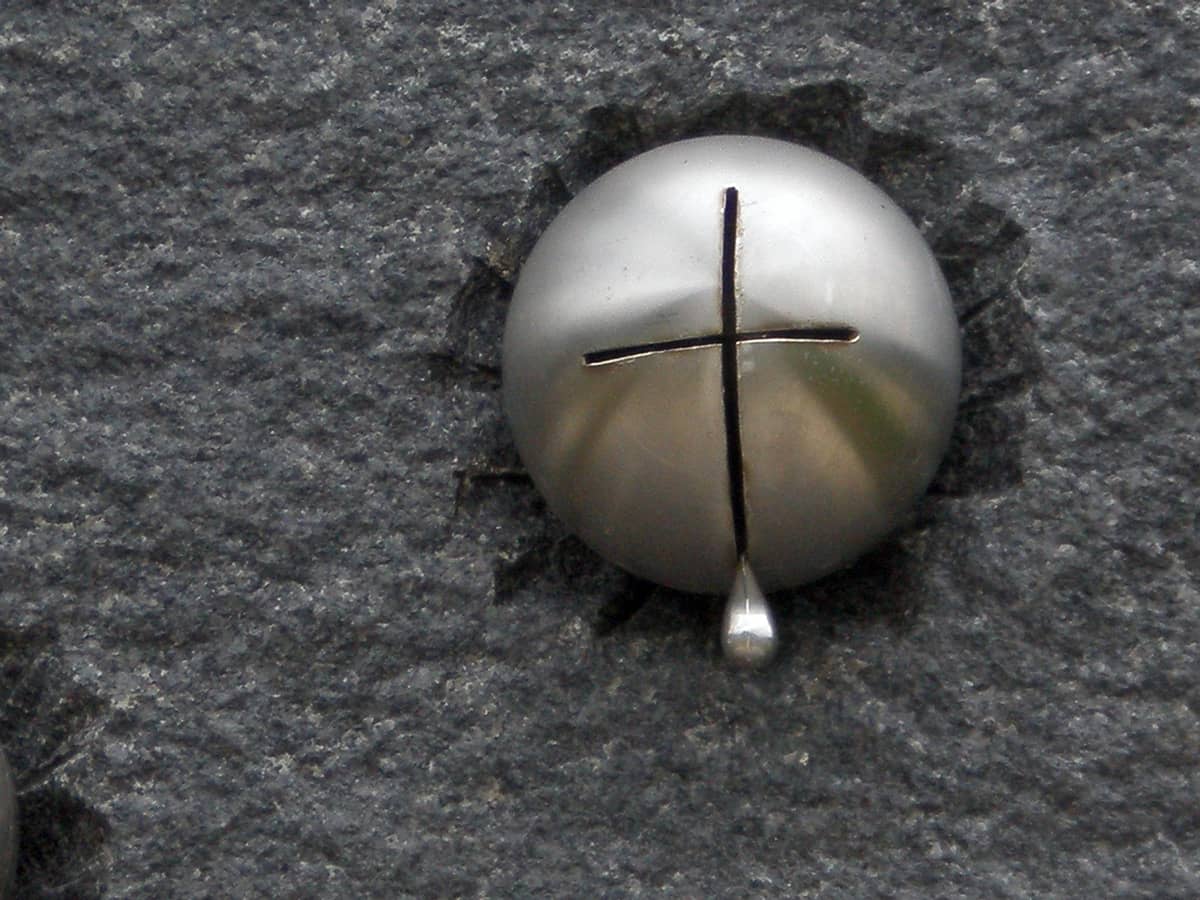 Monolitni granitni blok je ročno rustikalno obdelan, z izdolbljenimi gnezdi za sonce in nerjaveče krogle. Na vrhu bloka je izdolbina, kjer je vdelano sonce iz brona, pozlačeno s 24-karatnim zlatom, ki je na eni strani proti Savi čisto – gladko, proti brežini pa z vrelcem solza, katere ponazarjajo sonce, ki se je zjokalo. Pod njim pa je po celi površini monolita vpetih 26 nerjavečih krogel, od katerih ima polovica vrezan križ, iz katerega mezi solza.